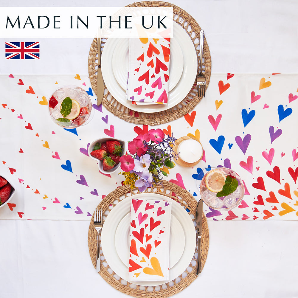 Made from 100% half panama cotton, 230gsm weight, this Rainbow Hearts Table Runner look stunning when paired with the matching Rainbow Hearts Cloth Napkin